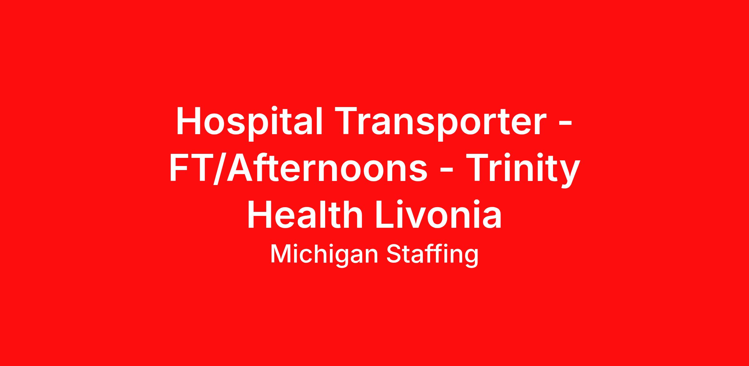 Job Summary: Join Trinity Health Livonia and become a vital part of our patient care team. As a Hospital Transporter, you will ensure the safe and timely movement of patients and equipment throughout our 304-bed acute care hospital.