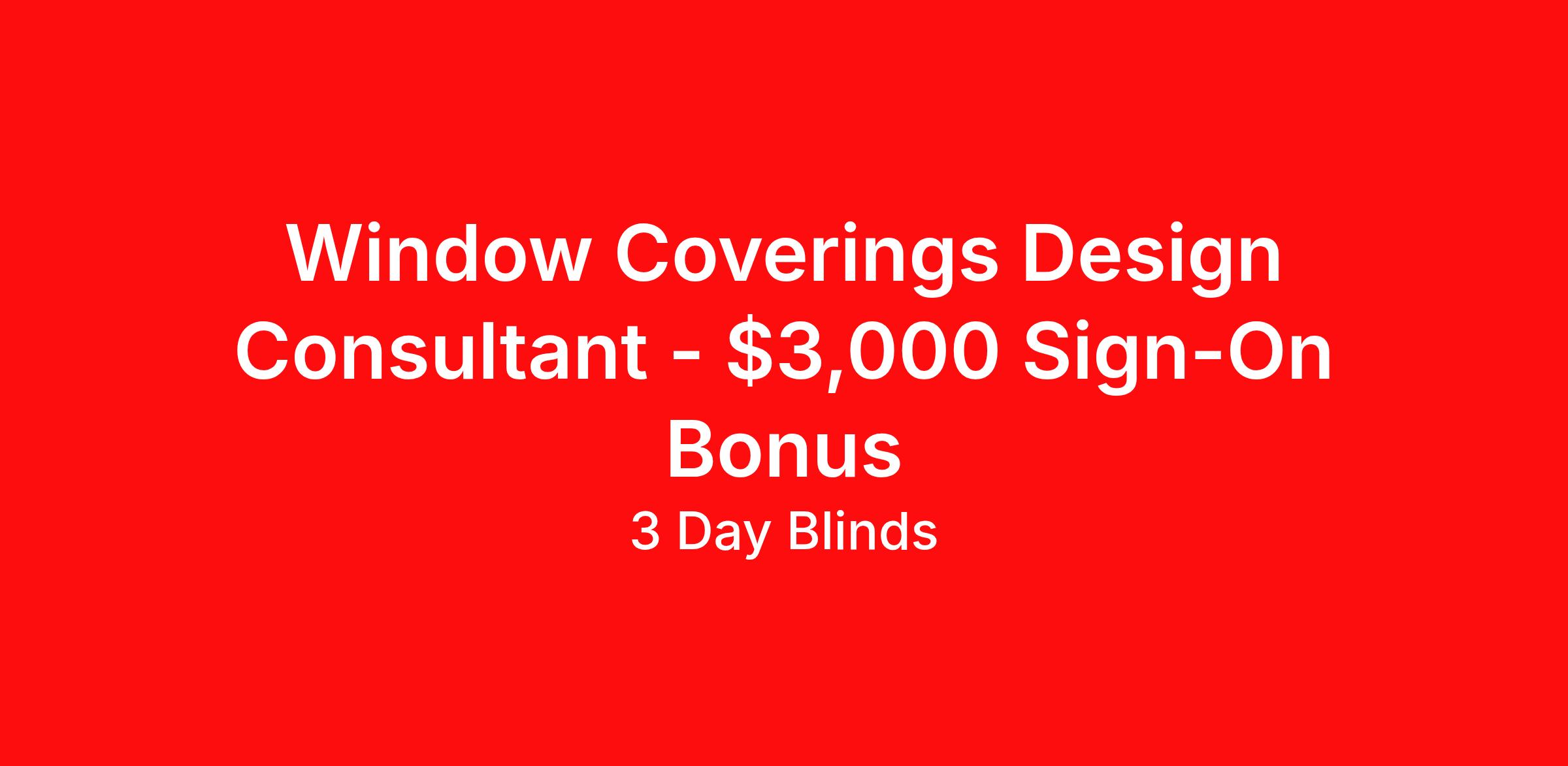 We are offering a $3,000 sign-on bonus for new Design Consultants who are part of the Toms River market. Terms are as follows: $1500 will be paid out after 30 days and an additional $1,500 will be paid after 60 days of service and good-standing and active employment with 3 Day Blinds.